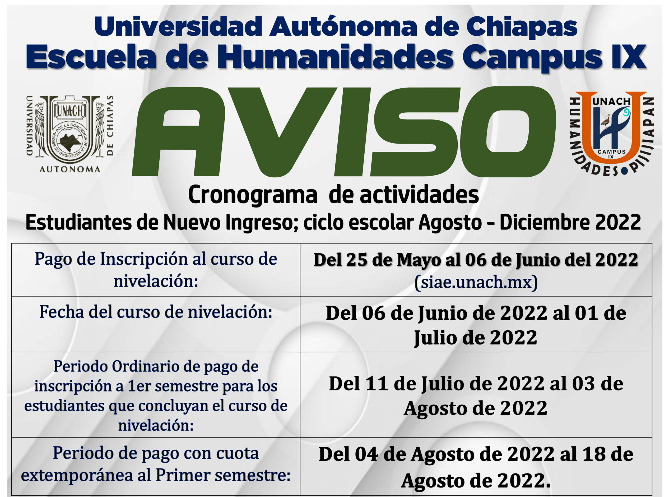 Cronograma. Modulo Nuevo Ingreso a Pregrado (MNIP). Humanidades Campus IX