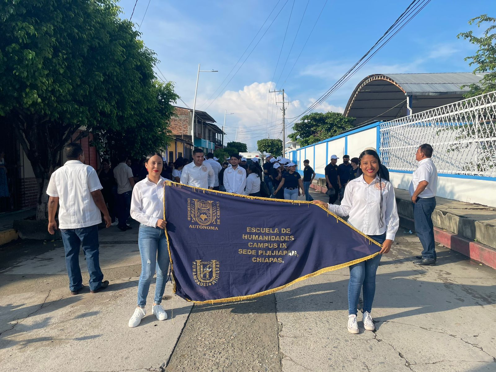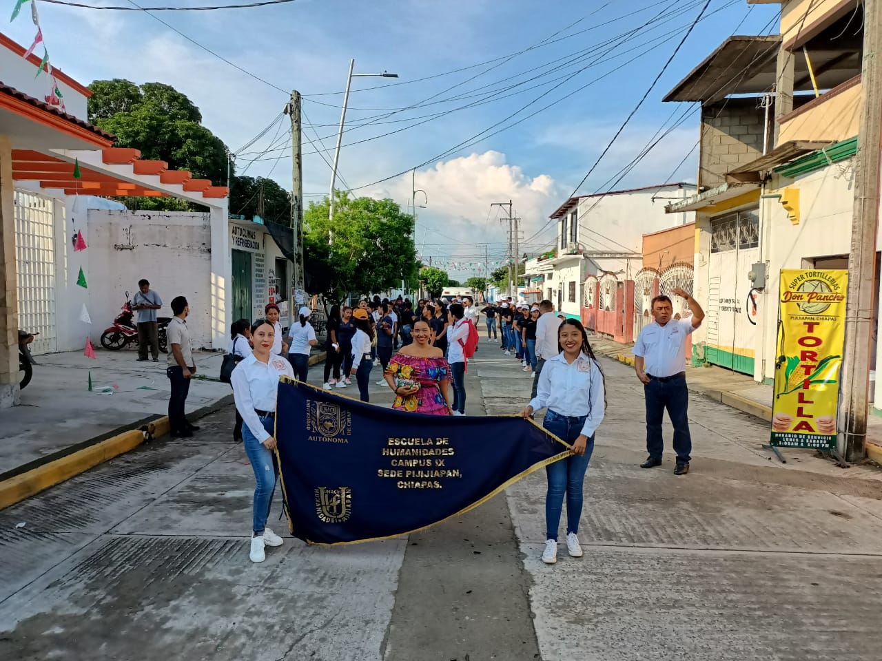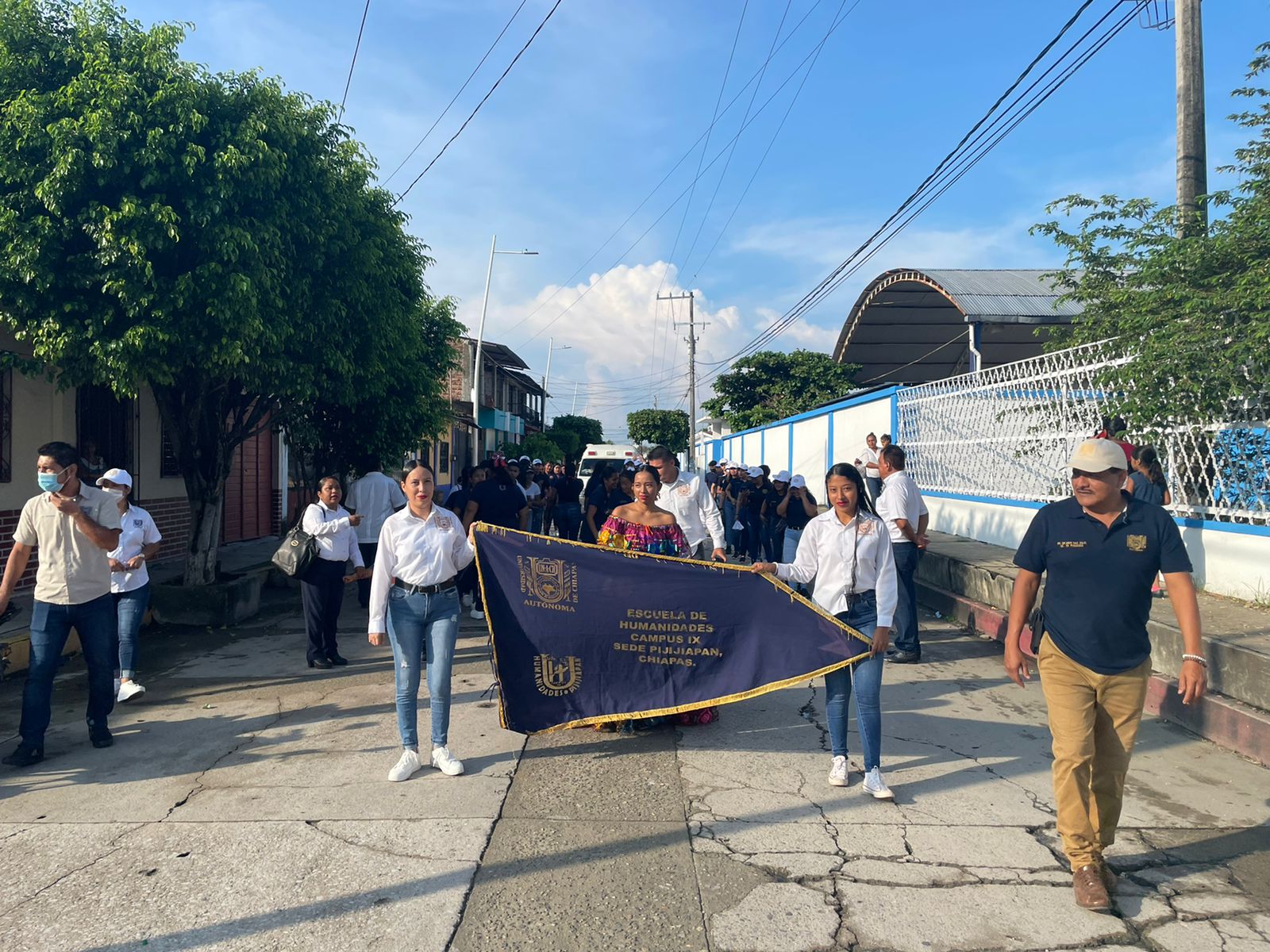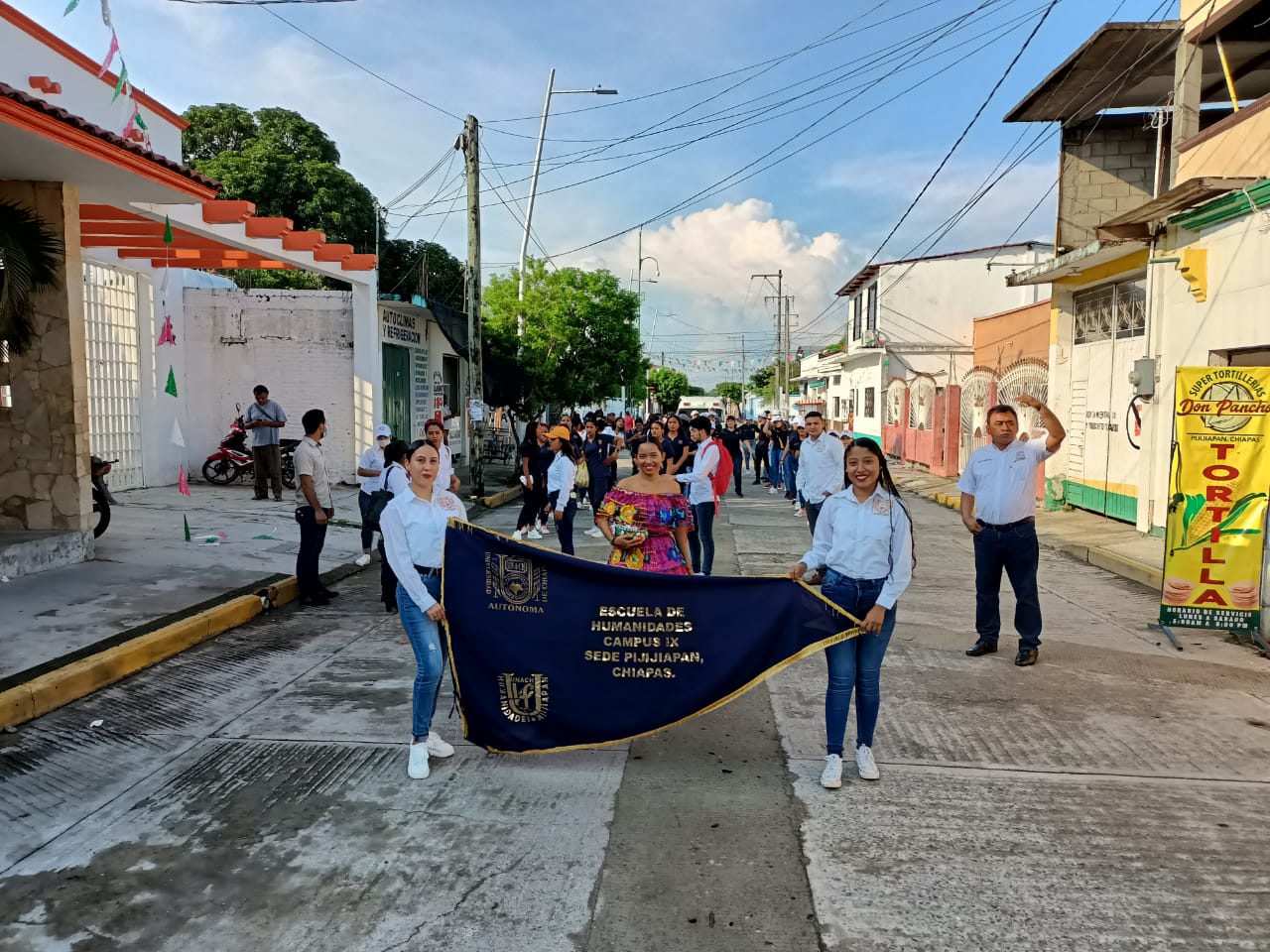 Pijijiapan, Chiapas;16 de septiembre de 2022. La Escuela de Humanidades Campus IX, participó en el Desfile Cívico en conmemoración del 212 aniversario del inicio de Independencia de México; se contó con la participación de alumnos y alumnas de la Licenciatura en Pedagogía, así como de la Licenciatura en Puericultura y Desarrollo Infantil, personal directivo y docente que conforman la unidad académica.