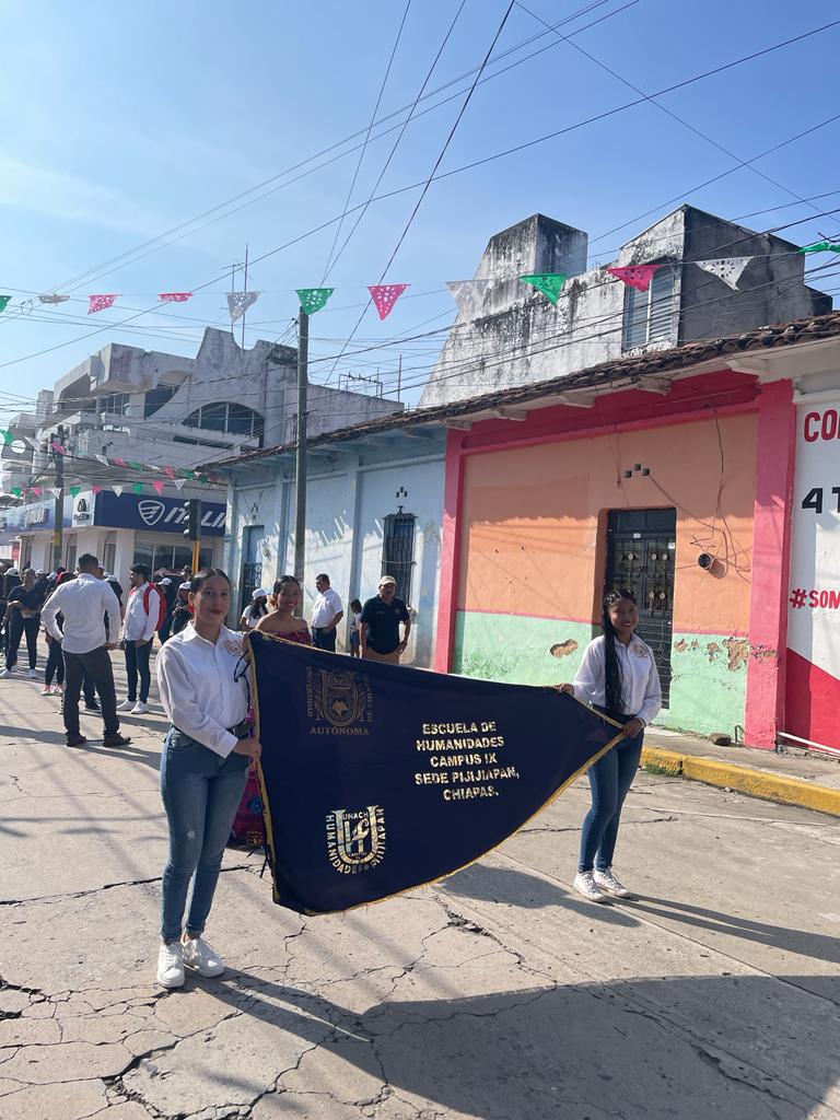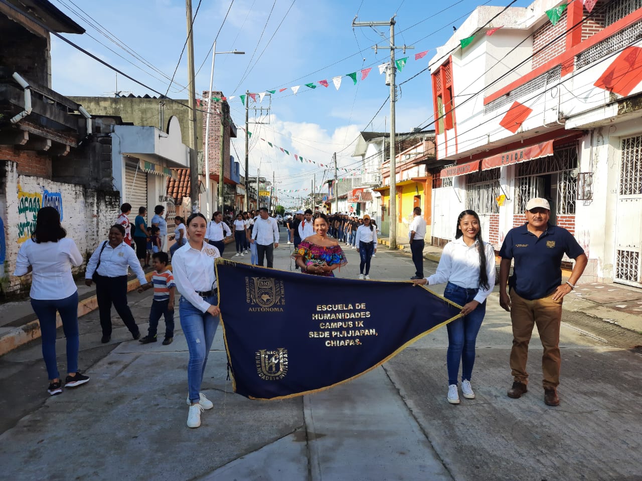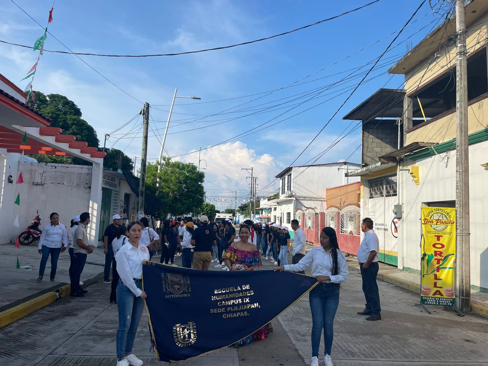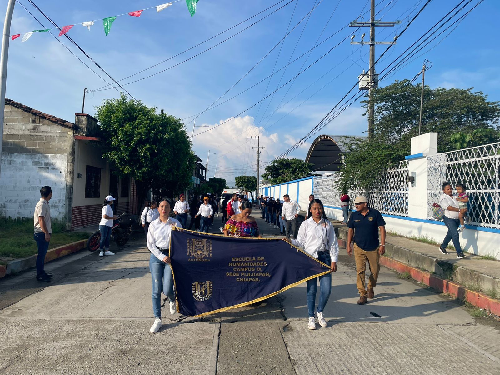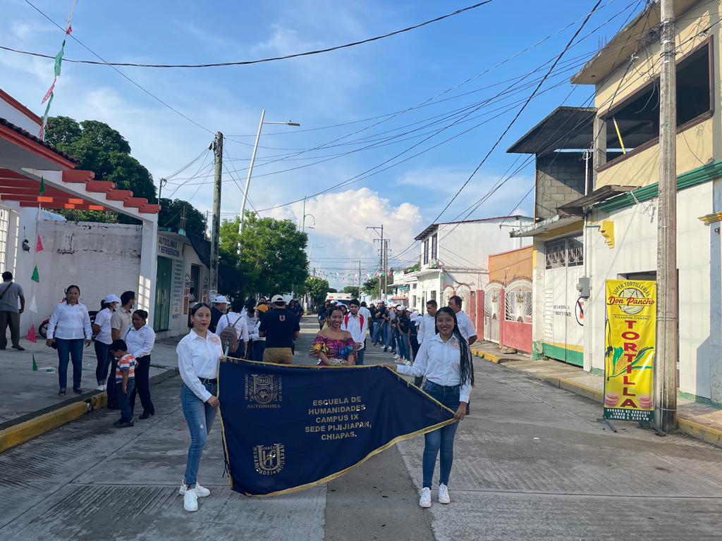 Pijijiapan, Chiapas;16 de septiembre de 2022. La Escuela de Humanidades Campus IX, participó en el Desfile Cívico en conmemoración del 212 aniversario del inicio de Independencia de México; se contó con la participación de alumnos y alumnas de la Licenciatura en Pedagogía, así como de la Licenciatura en Puericultura y Desarrollo Infantil, personal directivo y docente que conforman la unidad académica.