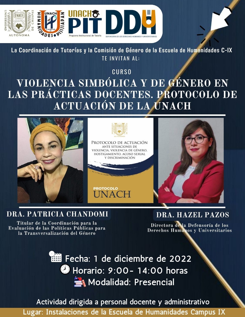 La Coordinación de Tutorías de la Escuela de Humanidades– Campus IX, Pijijiapan y la Comisión de Género de la sede adscrita a la Defensoría de los Derechos Humanos y Universitarios INVITAN a participar al personal docente y administrativo de la Escuela en el Curso: Violencia simbólica y de género en las prácticas docentes. Protocolo de Actuación de la UNACH impartido por la Dra. Hazel Pazos; Directora de la Defensoría de los Derechos Humanos y Universitarios y por la Dra. Patricia Chandomi; Titular de la Coordinación para la Evaluación de las Políticas Públicas para la Transversalización del Género el día 1 de diciembre del presente año en las Instalaciones de la Escuela de Humanidades Campus IX, Pijijiapan, Chiapas.