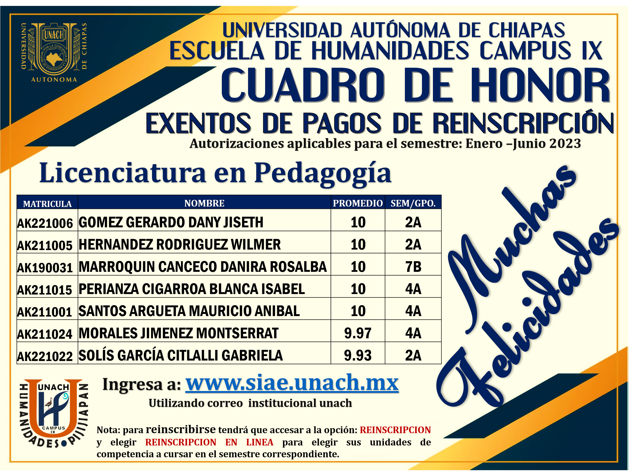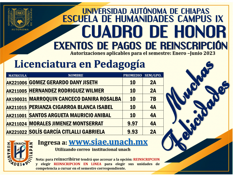 Cuadro de Honor Licenciatura en Pedagogia, ciclo agosto - diciembre 2022