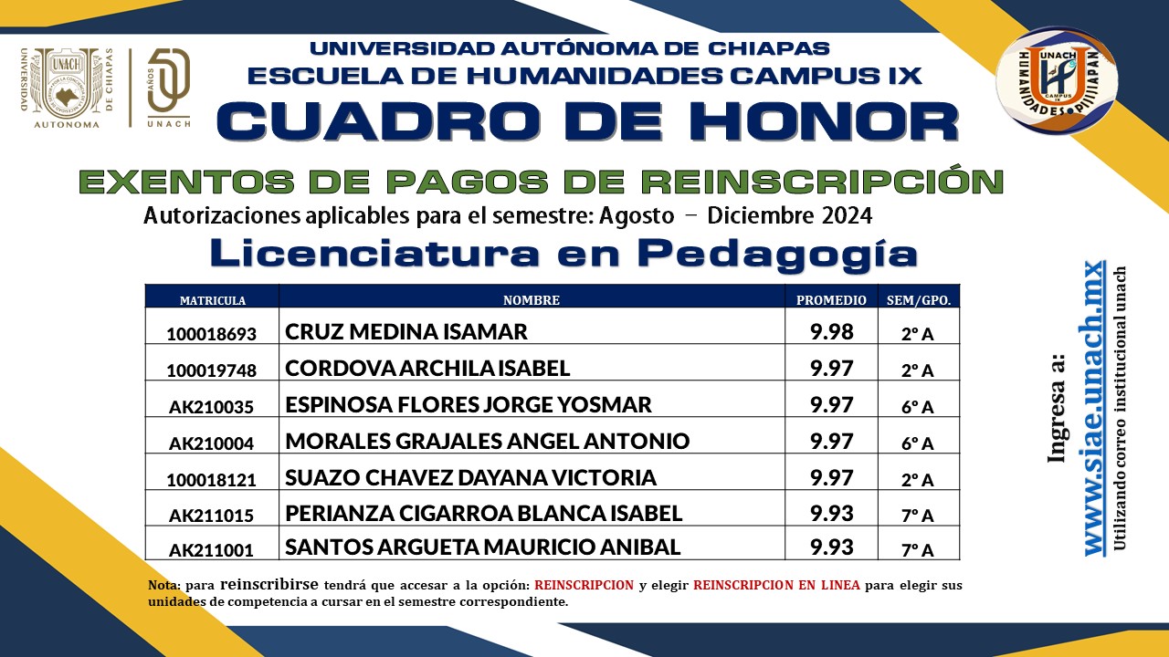 Cuadro de Honor de Estudiantes de Licenciatura en Pedagogía