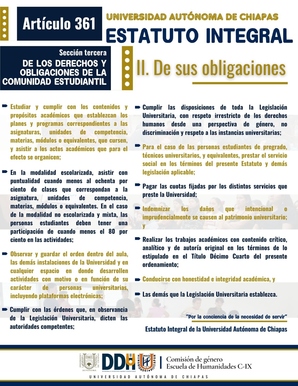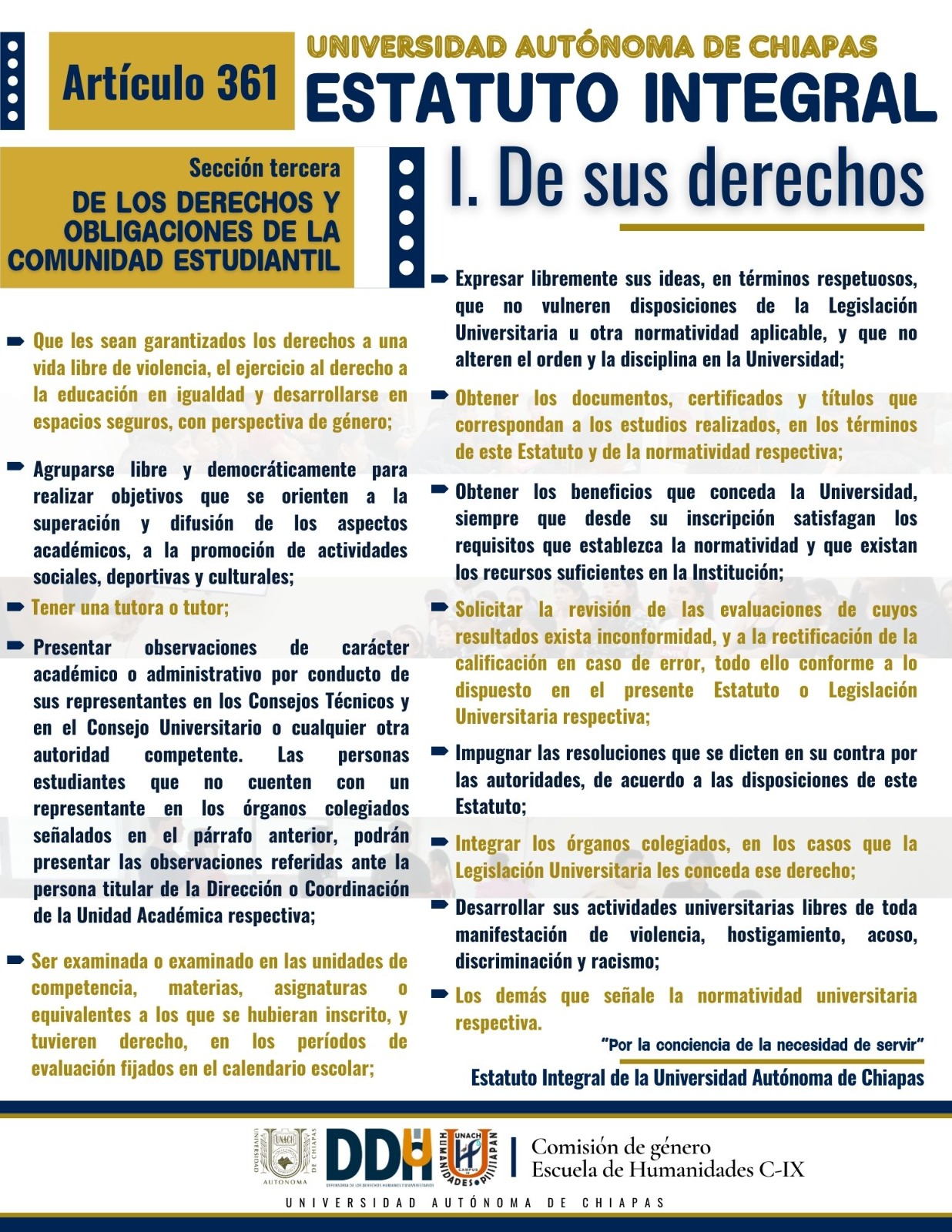 Te invitamos a conocer los derechos y obligaciones de la comunidad estudiantil que se encuentran enunciados en el Estatuto Integral de nuestra máxima casa de estudios.