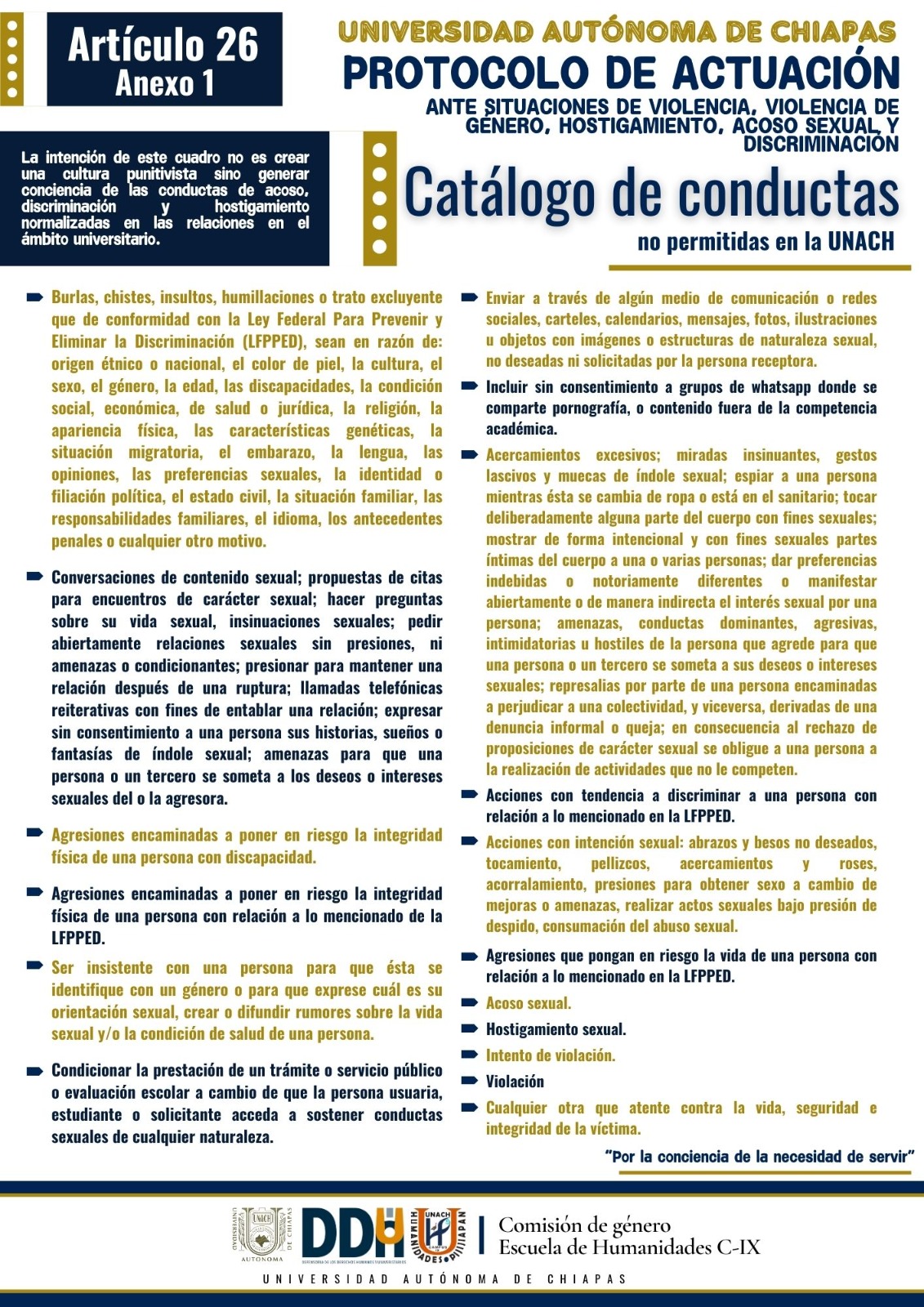 Entre uno de los elementos que contiene dicho documento se encuentra el "Catálogo de Conductas" no permitidas en la Universidad, mismas que se enuncian para generar conciencia de aquellas conductas de violencia que se han normalizado en el ámbito educativo.