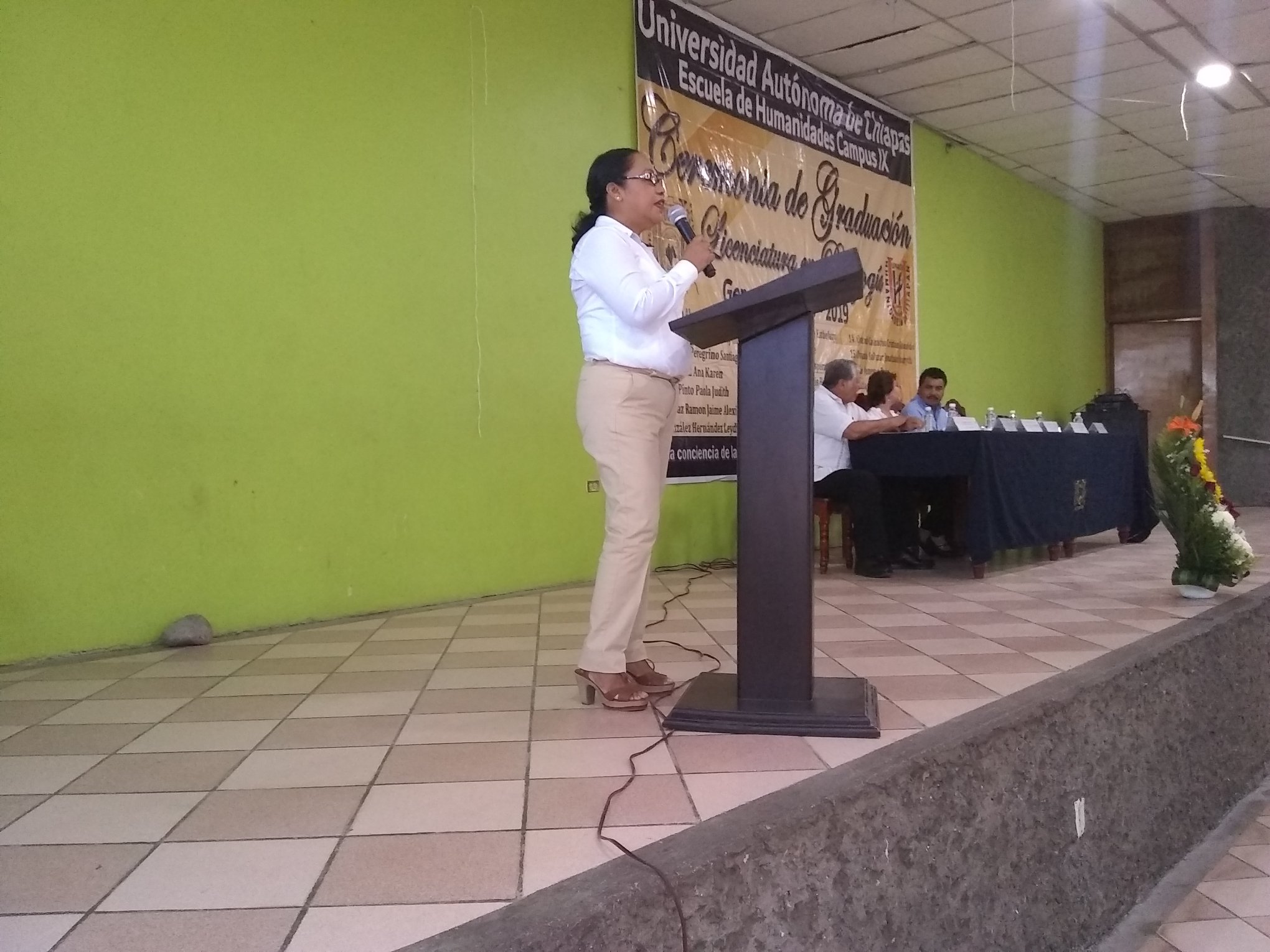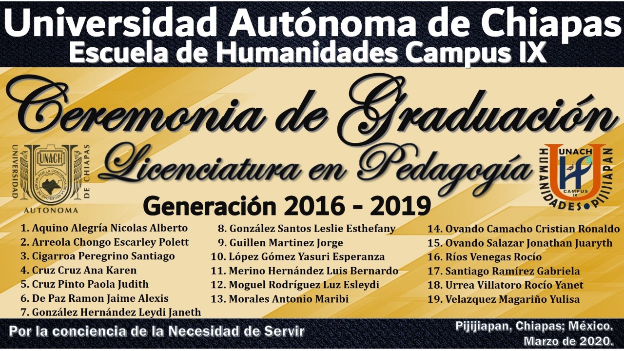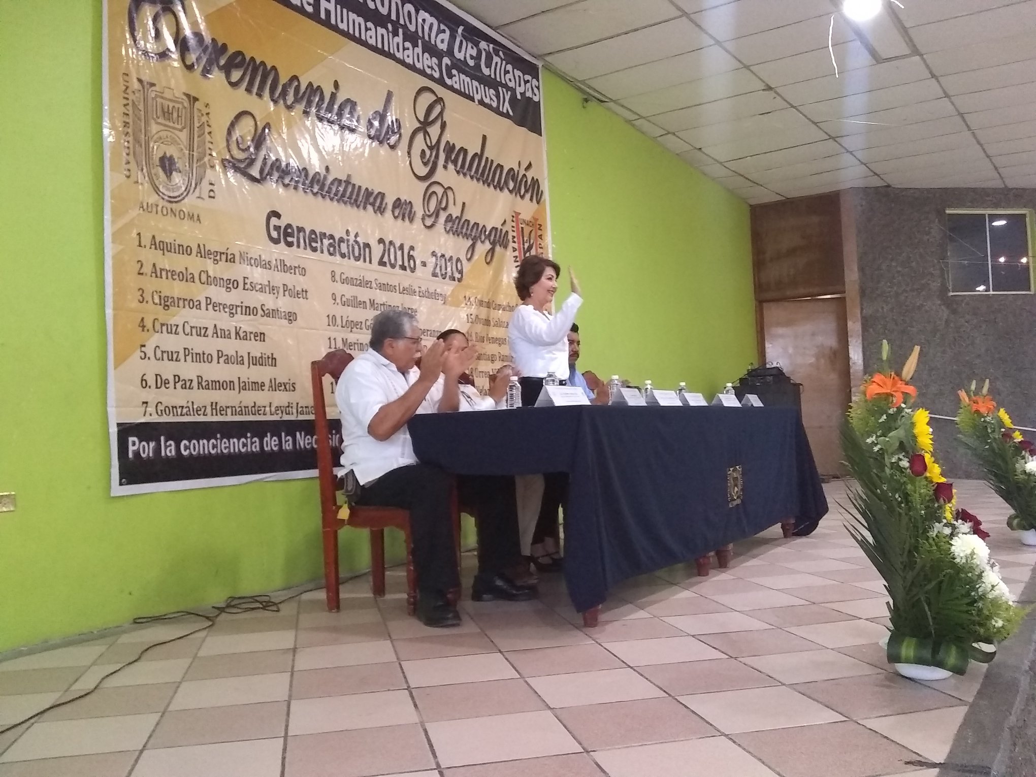 Pijijiapan, Chiapas; Marzo 06 de 2020; La Escuela de Humanidades Campus IX; realizó el evento de GRADUACIÓN de la 2a Generación de Licenciados en Pedagogía; se contó con la presencia de la Dra. Leticia del Carmen Flores Alfaro; (Secretaria Académica de la UNACH), el Dip. Nolberto Farfán Solís, la Lic. Isidra Duque Cruz (Encargada de la Dirección de la Escuela de Humanidades Campus IX), el Ing. Rafael vidal Cabrera (Presidente de Bienes Comunales de Pijijiapan). Así como también se contó con la distinguida presencia de Invitados especiales, personal docente, administrativos y de servicios de la Institución.